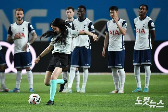 3일 저녁 서울 마포구 서울월드컵경기장에서 열린 2024 쿠팡플레이 시리즈 바이에른 뮌헨과 토트넘 홋스퍼의 경기에서 뉴진스의 민지가 시축을 하고 있다.