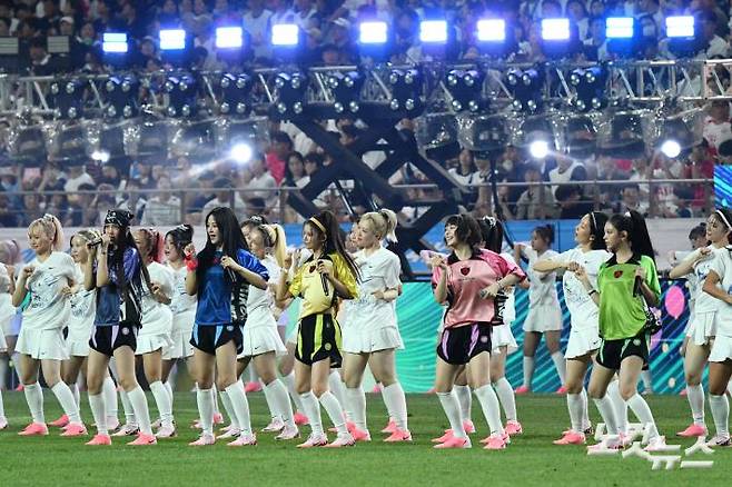 3일 저녁 서울 마포구 서울월드컵경기장에서 열린 2024 쿠팡플레이 시리즈 바이에른 뮌헨과 토트넘 홋스퍼의 경기에서 뉴진스가 하프타임 공연을 펼치고 있다.