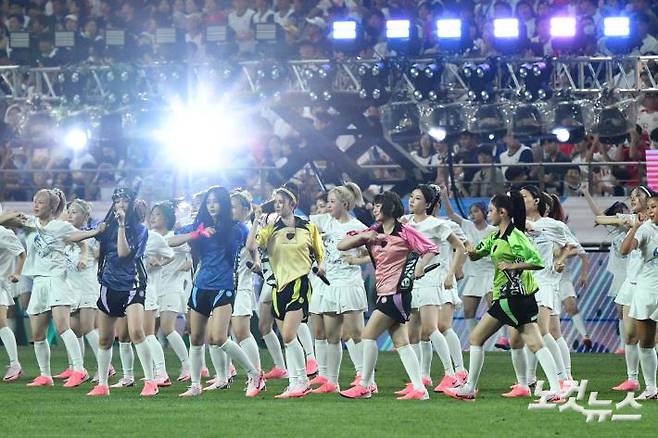 3일 저녁 서울 마포구 서울월드컵경기장에서 열린 2024 쿠팡플레이 시리즈 바이에른 뮌헨과 토트넘 홋스퍼의 경기에서 뉴진스가 하프타임 공연을 진행하고 있다.