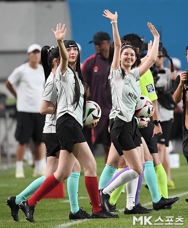 뉴진스 다니엘, 혜인이 축구 팬들에게 인사하고 있다.