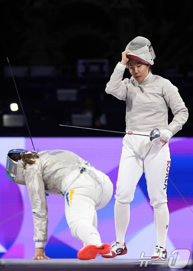 (파리(프랑스)=뉴스1) 이동해 기자 = 대한민국 펜싱 대표팀 전하영이 4일(한국시간) 프랑스 파리 그랑 팔레에서 열린 2024 파리올림픽 여자 사브르 단체 금메달 결정전 우크라이나 알리나 코마시추크와의 경기에서 득점한 후 장비를 벗고 있다. 2024.8.4/뉴스1