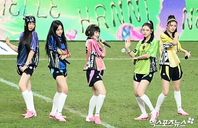 (엑스포츠뉴스 서울월드컵경기장, 김한준 기자) 3일 오후 서울월드컵경기장에서 열린 '2024 쿠팡플레이 시리즈' 토트넘 홋스퍼와 바이에른 뮌헨의 경기, 하프타임때 걸그룹 뉴진스가 멋진 공연을 선보이고 있다.
