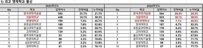 과학고·영재학교 출신 신입생이 가장 많이 택한 대학은 여전히 한국과학기술원(KAIST)이었지만, 지난해 583명(21.7%)에서 올해 564명(20.3%)로 감소했다.