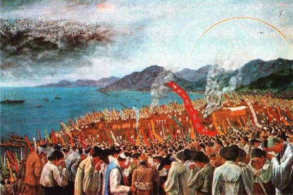 | ▲ 최익현 유해 환국 대마도에서 영구가 부산항에 도착하자 하늘에 갑자기 쌍무지개가 떴다. |