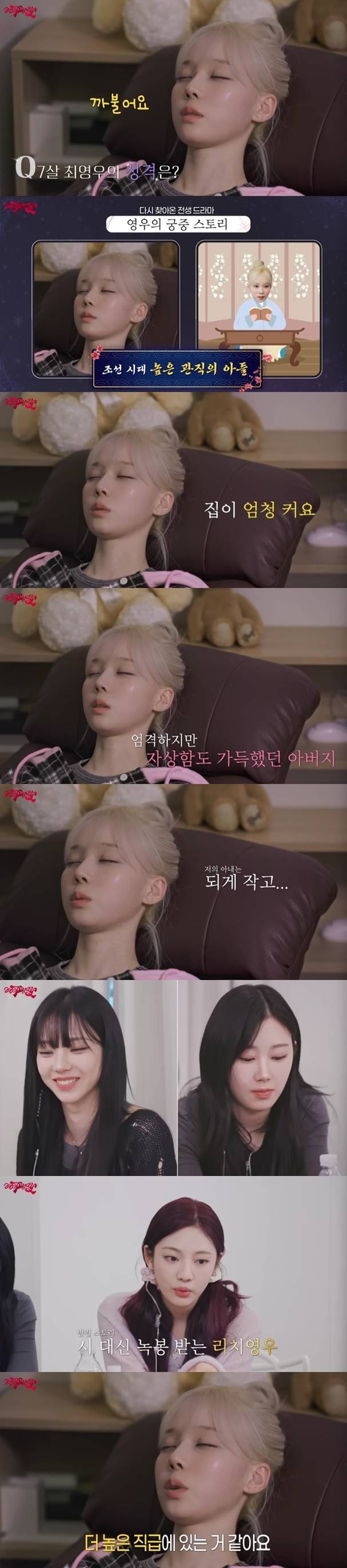 그러면서 "집이 엄청 크다. 아버지는 엄하기도 한데 자상하다. 나랏일하는 높은 사람인 것 같다. 왕은 아닌 것 같다. 왕의 신하 정도다"라며 전생의 신분을 언급했다.