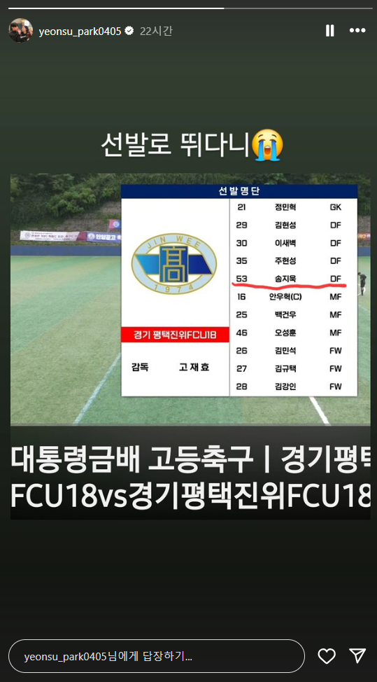 이어 공개된 사진 속에는 대통령금배 고등 축구 경기에 선발로 뽑인 송지욱의 이름이 캡처돼 담겨있다.