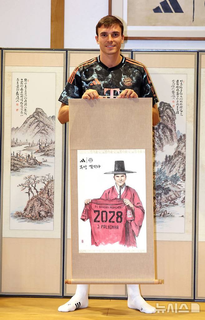 [서울=뉴시스] 이영환 기자 = 4일 오후 서울 강남구 아디다스 강남브랜드센터에서 열린 FC 바이에른 뮌헨 방한 기념 이벤트에서 주앙 팔리냐가 상징적인 모습의 초상화 선물을 받은 후 기념촬영을 하고 있다. 2024.08.04. 20hwan@newsis.com