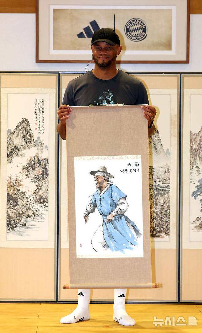 [서울=뉴시스] 이영환 기자 = 4일 오후 서울 강남구 아디다스 강남브랜드센터에서 열린 FC 바이에른 뮌헨 방한 기념 이벤트에서 빈센트 콤파니 감독이 상징적인 모습의 초상화 선물을 받은 후 기념촬영을 하고 있다. 2024.08.04. 20hwan@newsis.com