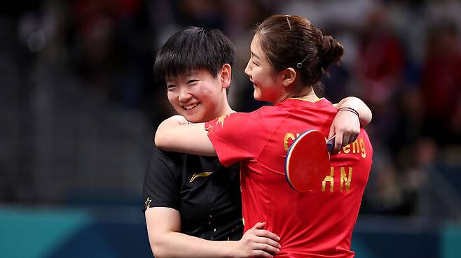 ▲ 올림픽 탁구 여자 단식 결승 후 포옹하는 쑨잉사(왼쪽)와 천멍(오른쪽)