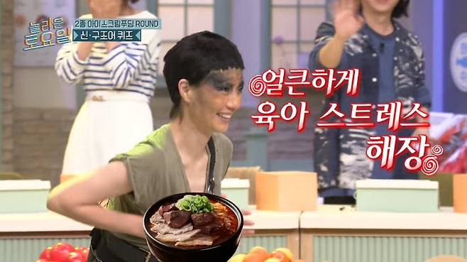 이날 퀴즈 도중 셀럽파이브의 ‘셔터’가 나왔고 태연과 안영미를 함께 무대로 나왔다. 태연은 당차게 안영미와 가슴춤을 췄지만 안영미는 더 나아가 업그레이드된 가슴춤을 선보였다. 가슴을 돌리는데 이어 짜는 듯한 액션까지 취했고 선 넘은 가슴춤에 모두가 기겁했다. 출연진들은 “이거 못 나가겠는데” “애기가 본다. 그만 하셔라. 어머니”라며 안영미를 제지하고 연행(?)했다.