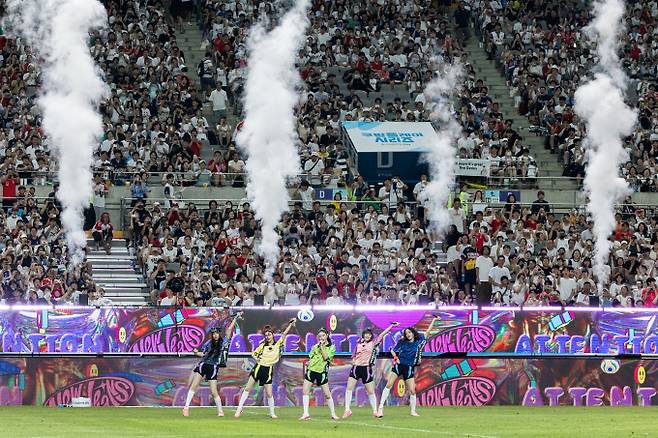 뉴진스는 이날 ‘Attention’과 ‘Hype Boy’, ‘ETA’, ‘Super Shy’ 등 히트곡 퍼레이드를 펼쳐 상암벌을 들썩이게 했다. 축구팬뿐 아니라 남녀노소 누구나 알고 있는 메가 히트곡의 힘은 강력했다. 대형 스타디움은 함성으로 가득 찼고, 청량감 가득한 이들의 노래는 한여름 밤 무더위를 날려버리기 충분했다.