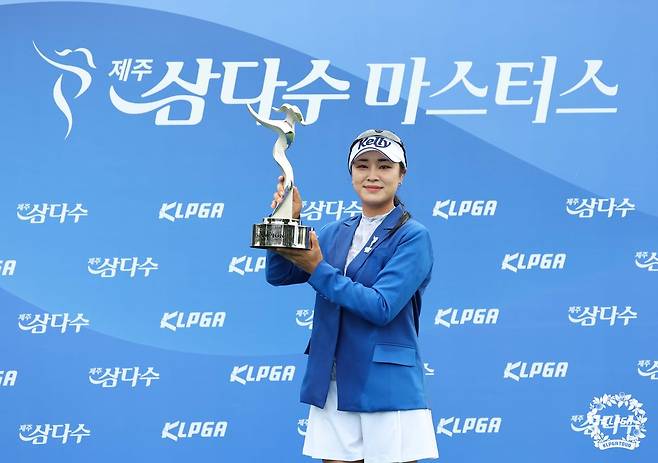 (서울=연합뉴스) 4일 제주 한림에 위치한 블랙스톤 제주CC에서 열린 '제11회 제주삼다수 마스터스' 마지막 라운드에서 우승한 윤이나가 트로피를 들어 보이고 있다. 2024.8.4 [KLPGT 제공. 재판매 및 DB 금지]