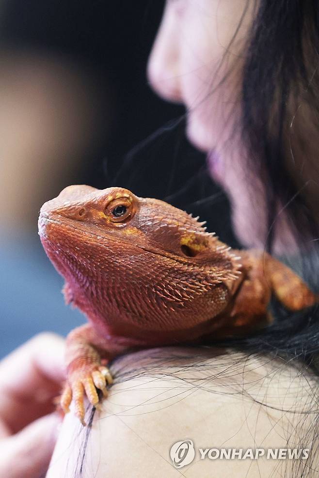 (서울=연합뉴스) 강민지 기자 = 4일 오전 서울 강남구 SETEC에서 열린 '제9회 한국 파충류쇼'에서 직원이 어깨에 파충류를 올려두고 있다. 2024.8.4