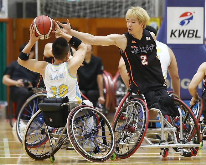 [서울=뉴시스] 추상철 기자 = 4일 대구광역시 대구시민체육관에서 '2024 KWBL 휠체어농구리그' 코웨이 블루휠스와 제주 삼다수 경기가 펼쳐지고 있다. (사진=한국휠체어농구연맹 제공) 2024.08.04.