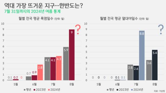 올해는 그럼 어떨까요. 평년(1991~2020년 평균), 그리고 지난해와 비교해봤습니다. 폭염도, 열대야도, 현재까지 과거 30년 평균은 물론, 2023년의 수준을 넘어섰습니다. 2024년 6월의 경우, 전국 평균 폭염일수가 2.8일로 평년의 4배, 직전 해의 3배에 달했습니다. 7월 폭염일수(2024년: 4.3일) 또한, 평년(4.1일)과 지난해(4.1일)의 수준을 넘어섰죠. 8월의 경우, 평년 기준으론 평균 5.9일의 폭염일수가 기록됐습니다. 2023년엔 이를 훌쩍 뛰어넘는 9일이 기록됐고요. 올해 8월은 어떻게 될지, 초순부터 전국적인 폭염특보가 발령되면서 걱정은 커지고 있습니다.