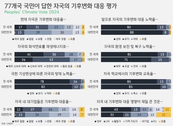 이번 UNDP의 설문조사에선 각자의 나라가 진행 중인 정책에 대한 평가와 앞으로 나아가야 할 방향에 대한 중지를 모으는 결과도 담겼습니다. 한국 시민사회는 국가의 기후변화 대응에 대한 평가가 세계 평균 대비 박했습니다. “당신의 나라는 기후변화 대응을 잘하고 있는가?”를 묻는 질문에 “매우 잘하고 있다”고 답한 한국 응답자는 1%에 그쳤습니다. 반면, 43%가 부정적(못함 30%, 매우 못함 13%)으로 평가했죠. 긍정적 평가가 48%(매우 잘함 17%, 잘함 31%)에 달하는 세계 평균에 크게 못 미치는 결과였습니다.