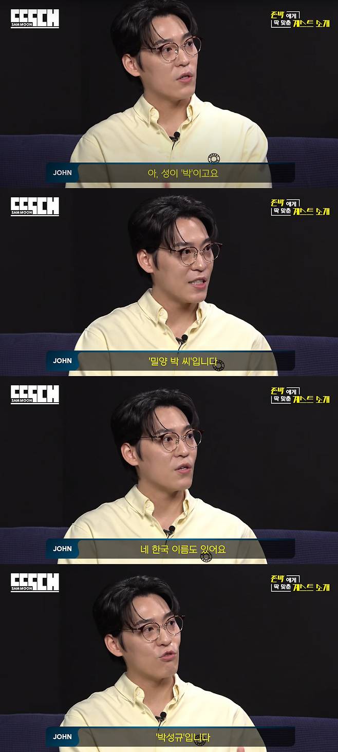 이날 샘문(문상훈)은 존박을 소개하며 "이름이 특이하다. 성이 존이냐 박이냐"라고 묻자 존박은 "성이 '박'이다. 밀양 박 씨다"라며 "한국 이름도 있다. 박성규이다"라고 밝혔다.