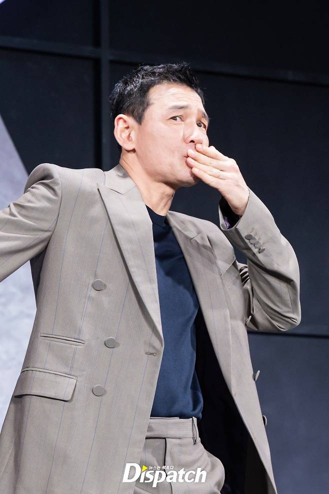 황정민은 그레이 수트로 멋을 냈다. '뽀뽀를 갈긴다'라는 뜻의 일명 '뽀갈' 포즈를 취하며 분위기를 띄웠다.