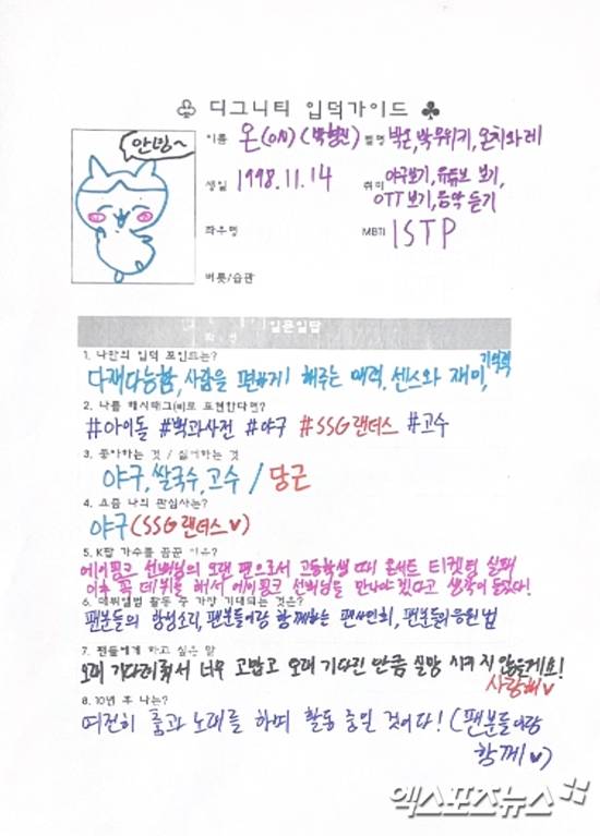 온: 초등학생 때 한국시리즈라고 챔피언을 결정하는 경기에서 SK와이번스(현 SSG 랜더스) 김광현 선수가 공을 던지는 모습을 보고 그때부터 빠져서 부모님과 같이 야구장을 가고 유니폼도 사고 굿즈도 모으면서 야구 덕질을 시작했어요. 연습생 생활하는 동안에는 잘 안 보다가 2022년 SSG랜더스가 한국시리즈 우승을 하면서 다시 덕심이 불타올랐죠. 그렇게 계속 야구를 좋아하고 있어요.