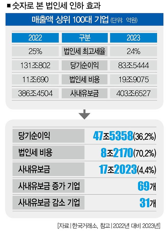 # 정부가 기업에 적용하는 법인세율을 인하한 지 1년이 훌쩍 지났다. 하지만 법인세 인하 효과를 둘러싼 갑론을박은 계속되고 있다. 그래서 우리는 법인세 인하 효과를 다시 한번 분석하기로 했다. 국내 증시 시가총액 상위 50개 기업의 사내유보금·무형자산취득 금액 추이 분석(2022년 3분기와 2023년 3분기), 투자활동현금흐름 분석(2022년과 2023년)에 이어 세번째 분석이다.
