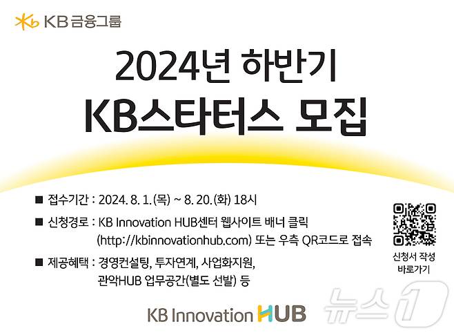 (서울=뉴스1) 박동해 기자 = KB금융그룹은 오는 20일까지 창업 3년 이내 스타트업을 대상으로 올해 하반기 'KB스타터스'를 모집한다고 밝혔다.