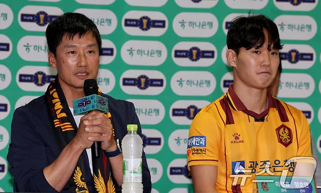 (서울=뉴스1) 장수영 기자 = 이정효 광주FC 감독과 정호연이 5일 오후 서울 종루구 대한축구협회에서 2024 하나은행 코리아컵 준결승전 대진추첨식에서 인터뷰 하고 있다. 2024.8.5/뉴스1