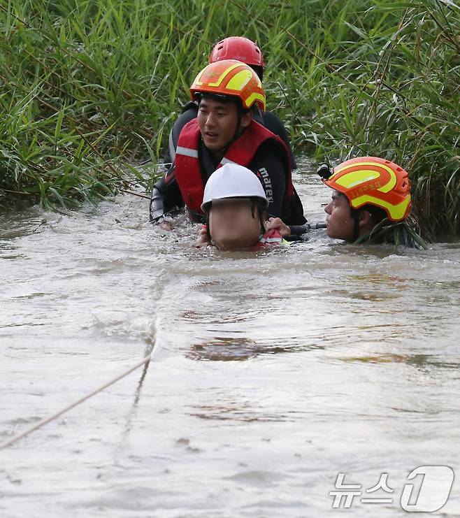 (대전=뉴스1) 김기태 기자 = 대전 소방대원들이 5일 오후 폭우에 불어난 대전 서구 유등천 삼천교 인근에서 조난자를 구조하고 있다. 2024.8.5/뉴스1