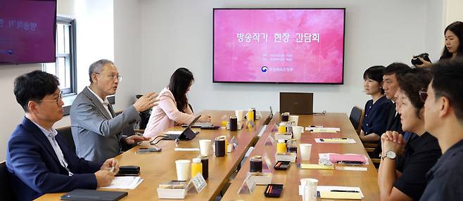 [서울=뉴시스] 김근수 기자 = 유인촌 문화체육관광부 장관이 5일 서울 종로구 국립현대미술관 서울관 회의실에서 정재홍 한국방송작가협회 이사장을 비롯한 방송작가들을 만나 방송영상콘텐츠 산업계 창작자 권리 보호와 발전방안에 대해 논의하고 있다. (사진= 문화체육관광부 제공) 2024.08.05. photo@newsis.com *재판매 및 DB 금지