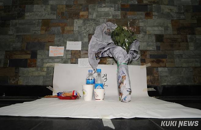 지난 2일 새벽 서울 중구 숭례문 인근 지하보도에서 청소하던 60대 청소노동자가 흉기에 찔려 사망한 자리에 조촐한 추모공간이 마련됐다.