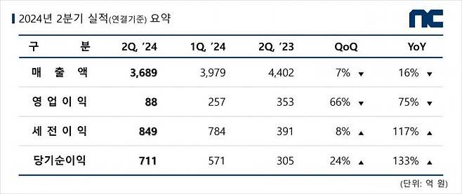 엔씨는 올해 2분기 연결기준 매출 3688억원, 영업이익 88억원을 기록했다고 5일 공시했다. 이는 전년 동기 대비 각각 16.2%, 74.9% 감소한 수치다.
