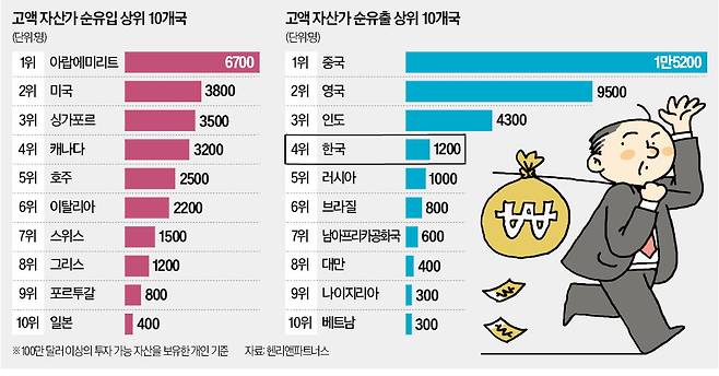 한국은 돈만 많으면 살기 좋은 나라라고 말하는 사람들이 있다. 세계 최고 수준의 교통·통신 인프라를 갖추고 있고 치안도 좋으니 돈만 있으면 뭐가 걱정이겠느냐는 얘기다. 그런데 꼭 그렇지는 않은 모양이다. 영국 투자이민 컨설팅 기업 헨리앤드파트너스 보고서를 보면 올해 한국에서 유동 자산 100만달러 이상인 부자가 1200명 순유출될 것이라고 한다. 왜 부자들은 한국을 떠나려 할까. 부자가 떠난 나라의 경제는 어떻게 될까.