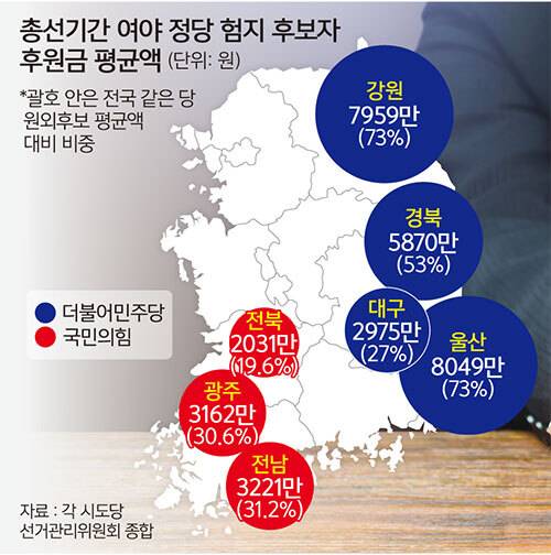1억3195만원 중 2527만원. 1억3838만원 중 4766만원. 지난 22대 총선 기간 더불어민주당과 국민의힘 후보자 후원회가 각각 모금한 금액과 ‘개인당 연간 300만원 초과 후원금 모금액’(이하 고액 후원금) 평균값이다. 기업인의 고액 후원금은 대부분 국민의힘 후보에게 쏠렸다.