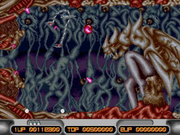 더욱 끔찍하게도 심장처럼 생긴 기관을 들락거리며 공격을 해온다는 점이 인상적이었죠. 이 보스의 코어는 심장처럼 생긴 기관의 맨 윗부분에 숨겨져 있는데 가끔가다 코어를 드러낼 때만 공격이 가능했습니다. 이러한 디자인들은 이후 등장한 비슷한 종류의 슈팅게임에 크게 영향을 미쳤다고 봐도 무방하다고 봅니다.