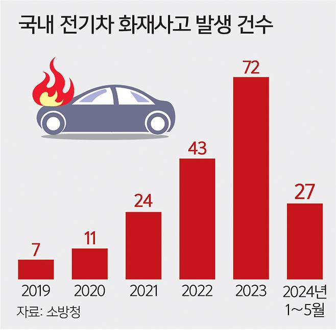 “기본적으로 전기차 화재 발생 비율은 내연기관차보다 낮지만 점차 올라가고 있는 추세다. 국토교통부의 자동차 등록자료와 소방청의 화재 통계에 따르면 내연기관 차량 1만대당 화재 발생 건수는 2017년 2.2건에서 2023년 1.9건으로 감소했다. 전기차는 2017년 0건에서 2023년 1.3건으로 늘었다.”(과학기술정책연구원 보고서)