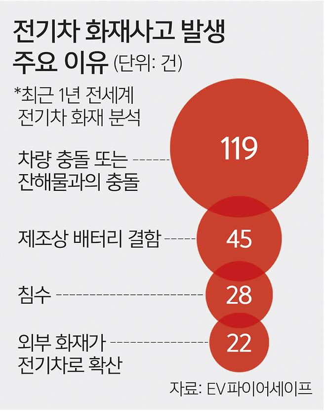 “전 세계 전기차 화재 중 원인이 밝혀진 건을 분석했을 때 원인은 크게 네 가지로 압축된다. 차량이나 잔해물과의 충돌, 제조상 배터리 결함, 침수, 외부 화재다. 전기차의 화재 위험을 높이는 요인은 배터리다. 분리막에 손상이 생겨 양극재와 음극재가 만나면 과도한 전류가 흐르고 열폭주를 일으키며 수시간 동안 화재가 지속된다.”(전기차 배터리 화재·대응 전문 호주 연구기관 EV 파이어세이프)