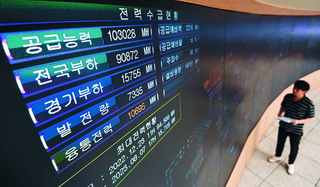 5일 경기도 수원시 한국전력공사 경기본부 전력관리처 계통운영센터에서 관계자가 전력수급현황을 확인하고 있다. 산업통상자원부는 이번 주 평일 오후 5~6시 사이 올 여름 최대 전력 수요가 발생할 수 있다고 예측했다. 역대 여름철 최대 전력 수요는 지난해 8월 7일 93.6GW였다.
