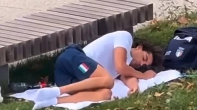 ▲ 선수촌 내 잔디밭에서 낮잠 자는 이탈리아 수영 금메달리스트 토마스 체콘