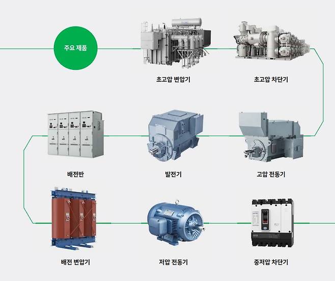 생산하는 제품은 전력 공급 단계에 따라 전력기기, 배전기기, 회전기기 등으로 나뉜다. 전력기기로는 발전·송전 단계(고압, 통상 50kV 이상)에서 적용되는 전력변압기, 고압차단기 등이 있다. 중압(1~50kV)이나 저압(1kV 미만)에서 적용되는 배전반, 중저압차단기 등 배전기기도 있다. 또 전기에너지를 이용해 운동에너지를 발생시키는 전동기 등 회전기기도 주요 제품이다.