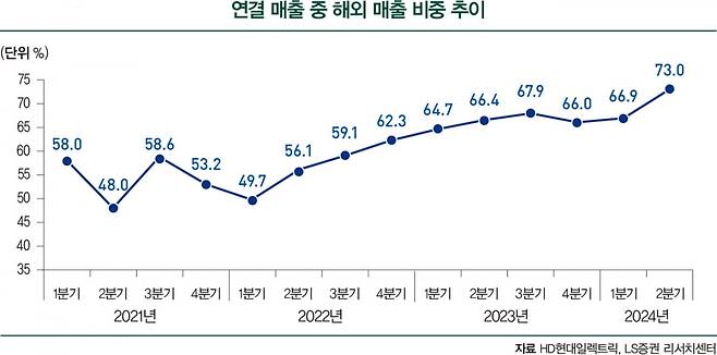 해외 매출 비중도 높아졌다. LS증권에 따르면, 2022년까지 50%대였던 해외 매출 비중은 지난해 60%대로 올라섰다. 올해는 2분기 해외 매출 비중이 73%에 달했다. 덕분에 2분기에는 시장 전망치를 뛰어넘는 영업이익 2100억 원의 호실적을 냈다. 전력기기 업황은 호황을 이어가고 있는데, 전 제품군에서 매출이 꾸준히 늘어난 결과다. 북미 초고압 변압기는 구조적으로 수요가 늘고 있다. 회전기기는 북미 쪽에서 친환경 프로젝트가 진행될 때마다 선박용 제품이 팔리고 있다. 강달러에 따른 환율 효과도 실적에 긍정적이다.