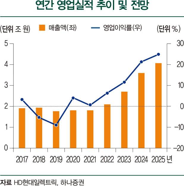 국내뿐 아니라 해외에서 전력망 투자가 늘면서 실적 상승세가 뚜렷하다. 2021년 1조8060억 원이던 매출은 2022년 2조1045억 원, 2023년 2조7028억 원으로 꾸준히 늘었다. 같은 기간 영업이익도 97억 원에서 3152억 원으로 급증했다. 올해 실적 전망치는 매출 3조4561억 원, 영업이익 5356억 원이다. 내년에는 매출 4조 원을 돌파할 것으로 증권사들은 예측하고 있다.