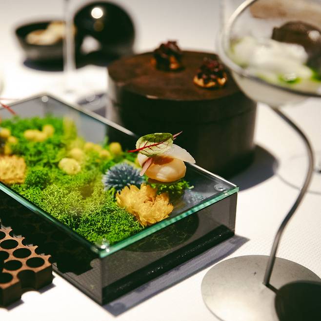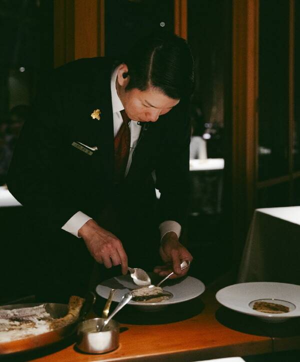 3시간에 걸친 만찬은 한 편의 연극이다. 아뮤즈 부쉬(amuse-bouche)부터 5가지 앙트레, 쁘아송(poisson, 생선), 비앙드(viande, 육류), 프로마쥬(fromage, 치즈), 데세르(dessert)까지 이어지는 식사는 가루이자와의 서사와 자연이 집약돼 있다. 이곳에서 시간을 보내고, 맛을 음미하는 것만으로도 가루이자와를 깊게 이해하게 된다. 와인 & 논알코올 페어링, 게리동 서비스(고객 테이블에서 조리하는 서비스) 등도 파리 못지않게 훌륭하다.