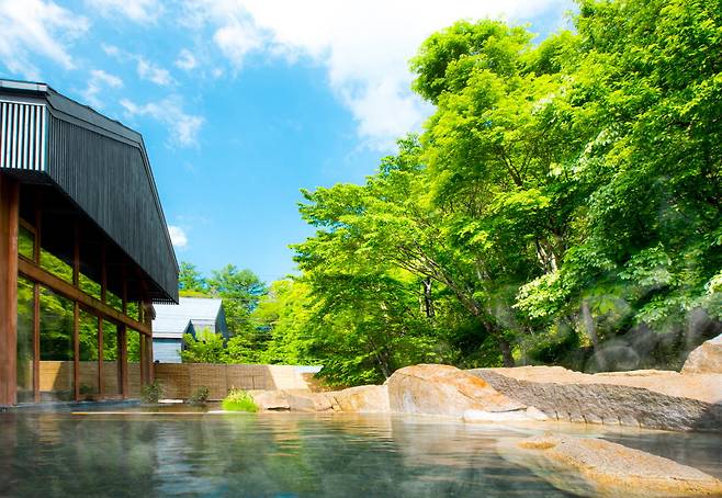 초록을 거닌 다음에는 천연 온천수에 들어갈 차례. 호시노 온천(1915년 개관)의 역사와 물을 고스란히 이어받은 '톤보노유(Tombo-no-yu)'로 향한다. 이곳은 원천수로만 채워진 실내탕과 노천탕, 연못과 이어진 냉탕, 사우나 등으로 구성돼 있다. 맑고, 신선함을 과시하듯 탕 입구에는 온천수를 마실 수 있는 수도꼭지도 설치돼 있다. 목을 축이고 따스한 온천에 몸을 맡긴다. 톤보노유 실내탕의 장점은 높은 층고, 어깨까지 푹 담글 수 있는 적당한 깊이(90cm, 여탕은 85cm), 계절의 변화를 감상할 수 있는 통창이다.