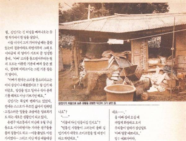 | ▲ 월간 <마드모아젤> 1987년 8월호 기사. 김민기 대표가 10여 년 전 머물렀던 익산 석암리집의 사진이 실려있다. |