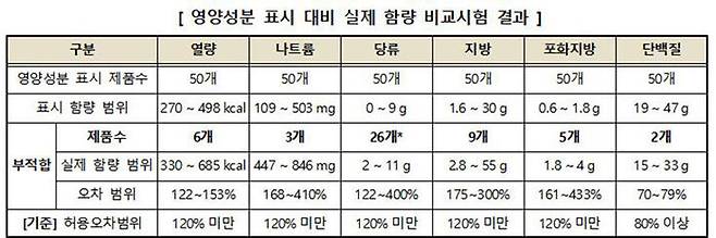 영양성분 함량을 표시한 제품 50개를 보면 실제와 다르게 함량을 표시한 제품이 33개에 달했습니다.