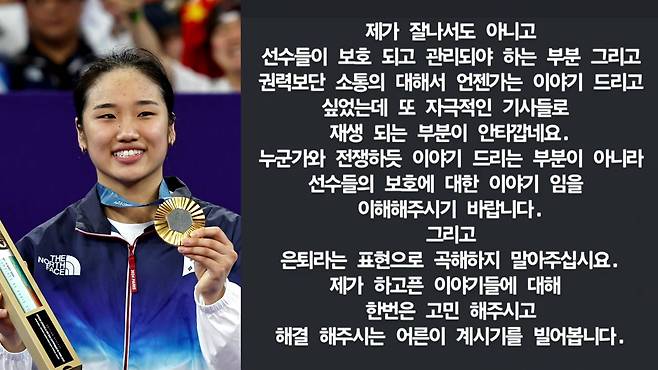 그렇습니다. 당장 기자들이 듣기에는 은퇴를 시사하는 것처럼 보였습니다. 왜냐하면 대표팀 선수가 대표팀을 같이 못 할 것 같다라고 하니까 당연히 은퇴하는 거 아니야라는 생각이 들고 그런 기사도 많이 쏟아졌죠. 그래서 이 얘기가 확산하니까 안세영이 직접 SNS에 글을 올렸습니다. 핵심은 은퇴라는 표현으로 곡해하지 말아달라. 자신은 선수 관리에 대한 부분을 말하고 싶었다고 했습니다. 비슷한 얘기가 이전에 인터뷰에서도 있기는 했습니다. 무릎 부상이 조금 심했고, 이걸 진단하는 과정에 오진이 있었다고 합니다. 그래서 올림픽에 나가는 과정에서 굉장히 어려웠다고, 힘들었다고 얘기를 했거든요. 우리가 또 선수 관리에 대한 문제라고 하면 혹시 너무 혹사시킨 것 아닌가라는 의심이 들게 하기도 하는데 안세영 선수는 일단 혹사에 대한 부분은 아니었다라고 언급했습니다.