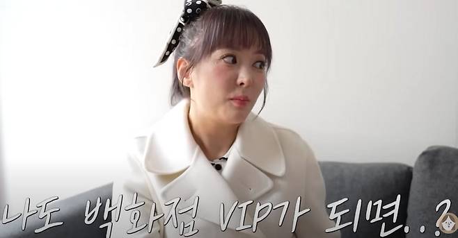 그녀는 "그런 걸 보고 나도 바람이 들었다. 나도 한번 대접 받아보자는 마음에 백화점 VIP가 되기 위해 돈을 엄청 썼는데 남는 건 없고, 결국 집도 못 샀다"라며 명품 소비 후 허탈했음을 밝혔다. 이어 "결국 '자스민 블루' VIP가 되고 나니, 내 것이 아니라는 걸 깨달았다"며 후회하는 모습을 보였다. 한편, 한 백화점의 VIP 등급 중 하나인 '자스민 블루'가 되기 위해서는 8천만 원에서 1억 원 정도의 금액을 소비해야 하는 것으로 알려진다.