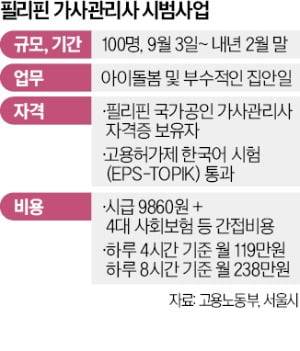 시범사업에 참여하는 인력은 필리핀 정부가 공인한 가사관리사 자격증이 있으며 현지에서 학습을 통해 한국어 구사 능력을 갖추고 있다. 모두 고용허가제 한국어 능력시험(EPS-TOPIK)을 통과했다. 건강검진과 마약·범죄 이력 등 신원 검증도 꼼꼼히 했다고 정부는 설명했다.