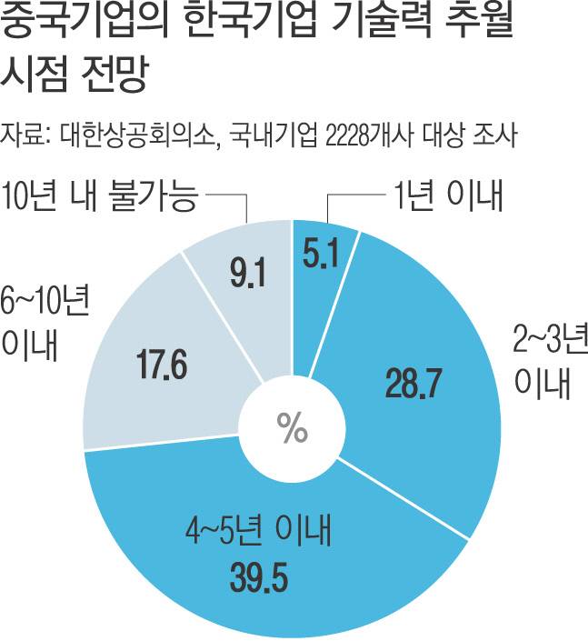 중국의 추격이 가속화하면서 국내 기업이 수년 내에 기술력을 추월당할 수 있다는 답변도 나왔다.