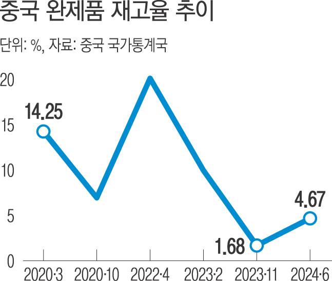 중국 국가통계국에 따르면 중국의 완제품 재고율은 코로나19 팬데믹 기간 소비와 부동산 경기 침체로 2020년 10월 6.94%에서 2022년 4월 20.11%로 급상승했다. 이후 중국 기업이 과잉 생산된 재고를 해외에 저가로 수출하면서 재고율은 2023년 11월 1.68%까지 떨어졌다. 그러나 중국의 경기 부진이 계속되면서 재고율은 지난 6월 4.67%로 다시 높아졌다.