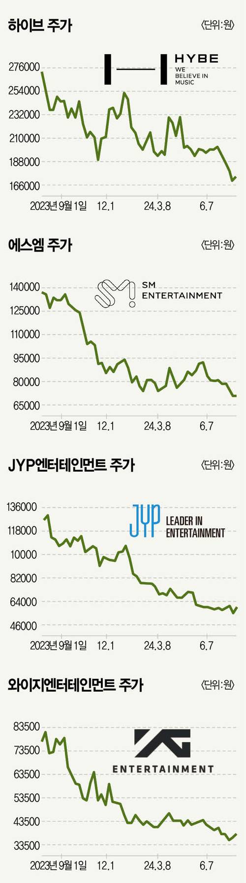 지난 6월 군 복무를 마친 방탄소년단(BTS) 맏형 진은 파리 올림픽에서 성화 봉송 주자로 활약했다. 진은 성화 봉송 주자 중 최대 화제 인물 중 한 명이었다. 전 세계적인 K팝 인기를 실감케 하는 순간이었다. 하지만 주식 시장에서는 다르다. K팝이 전 세계를 호령하고 있지만 대형 연예기획사 투자자는 한숨만 내쉬고 있다.